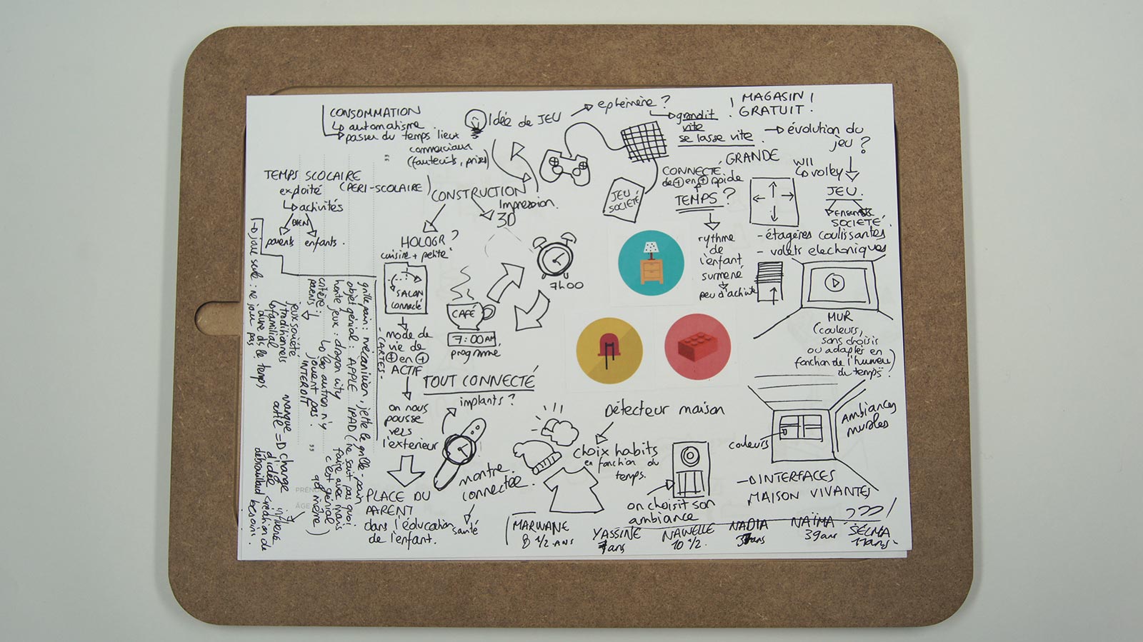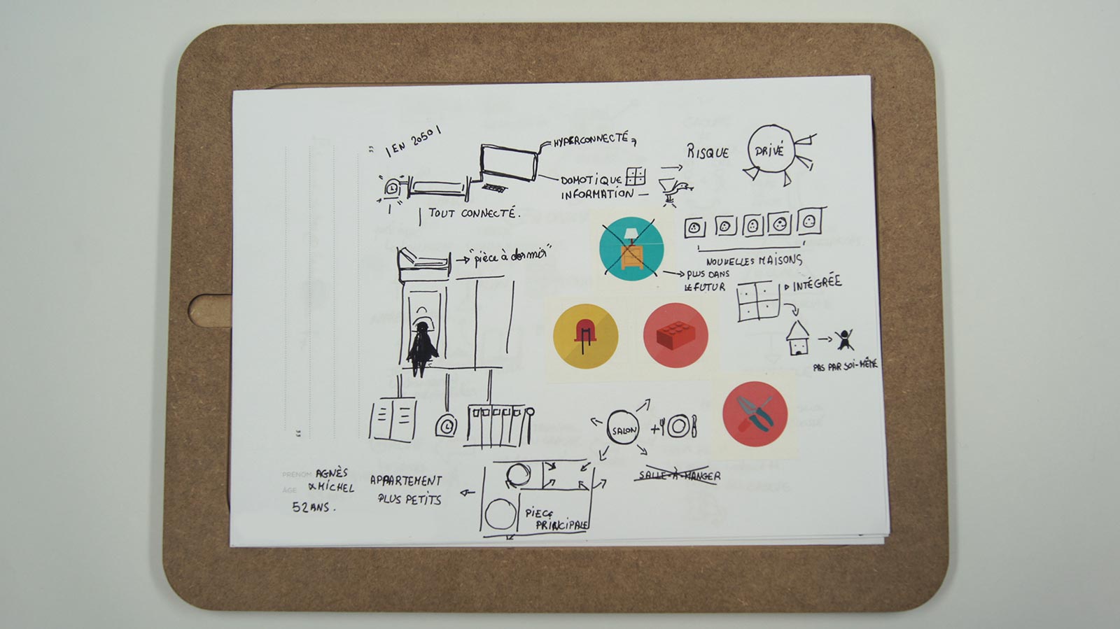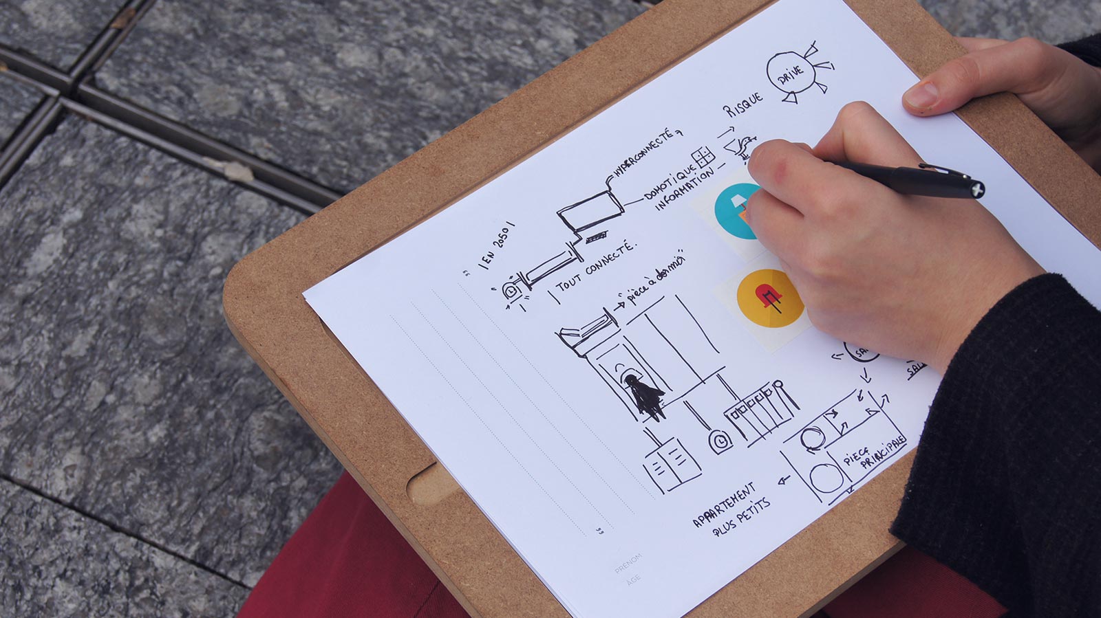 Nous avions un support de dessin, un plateau creux, où une feuille avec des icônes préparées à l’avance étaient choisies afin d’orienter le dialogue selon les 3 critères suivant : Lieu, moyen/outil, action. Tout ce que la personne disait était réinterprété graphiquement sur la feuille, le son était pris ainsi que les photos/vidéos de la rencontre.