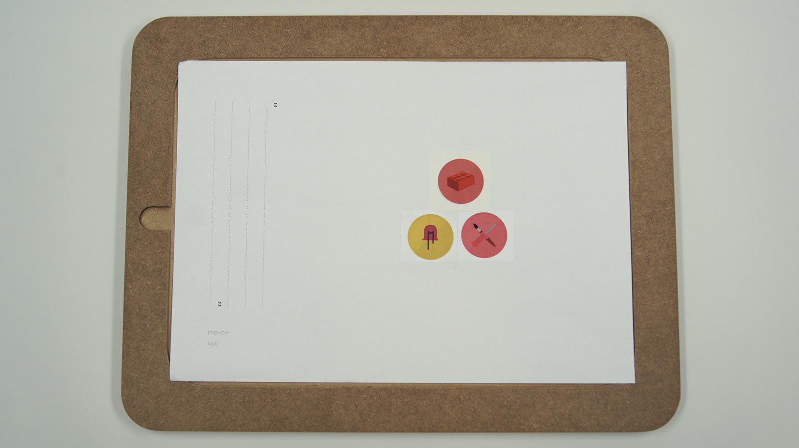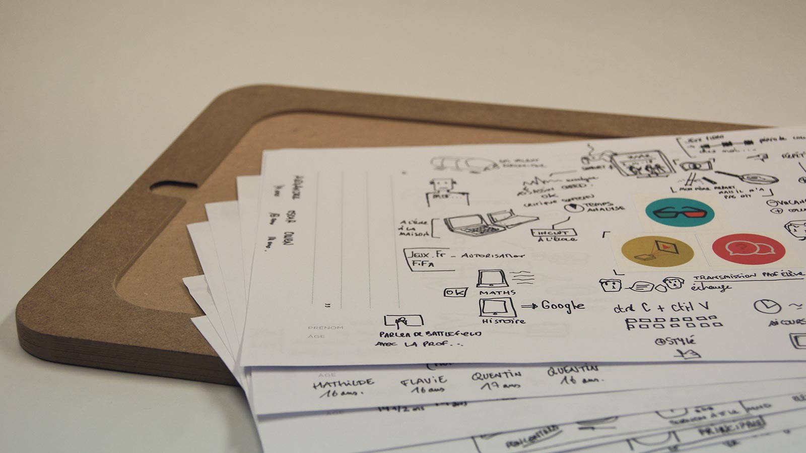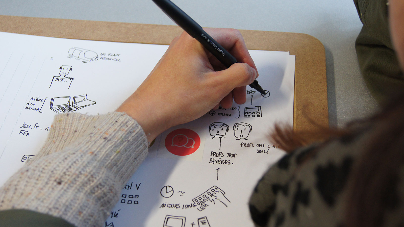 Nous avions un support de dessin, un plateau creux, où une feuille avec des icônes préparées à l’avance étaient choisies afin d’orienter le dialogue selon les 3 critères suivant : Lieu, moyen/outil, action. Tout ce que la personne disait était réinterprété graphiquement sur la feuille, le son était pris ainsi que les photos/vidéos de la rencontre.